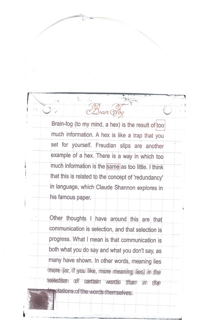 Run of two A6 pamphlets printed in red & black. One is strung with clear yellow elastic fishing line.